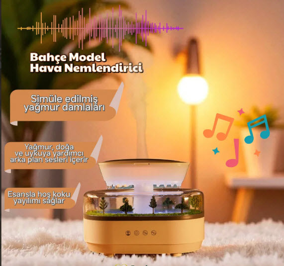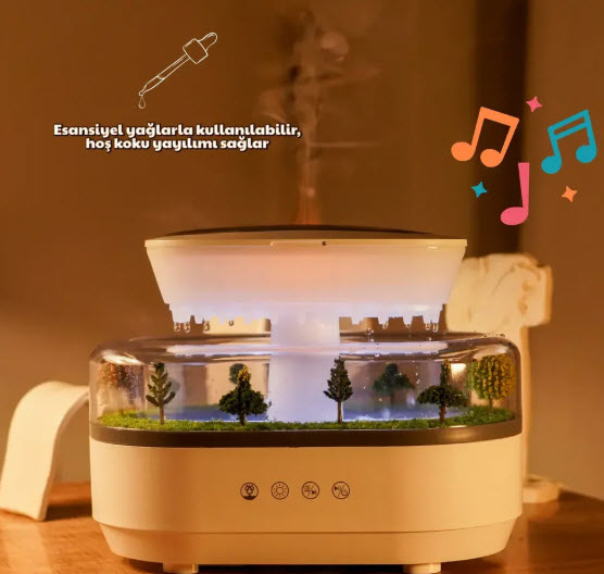 Hem dekoratif, hem fonksiyonel!Bu özel aromaterapi cihazı; yağmur damlası simülasyonu, beyaz gürültü ve estetik manzara detaylarıyla huzurlu bir ortam sunar. Uykuya dalmak, meditasyon yapmak veya sadece dinlenmek artık çok daha keyifli.