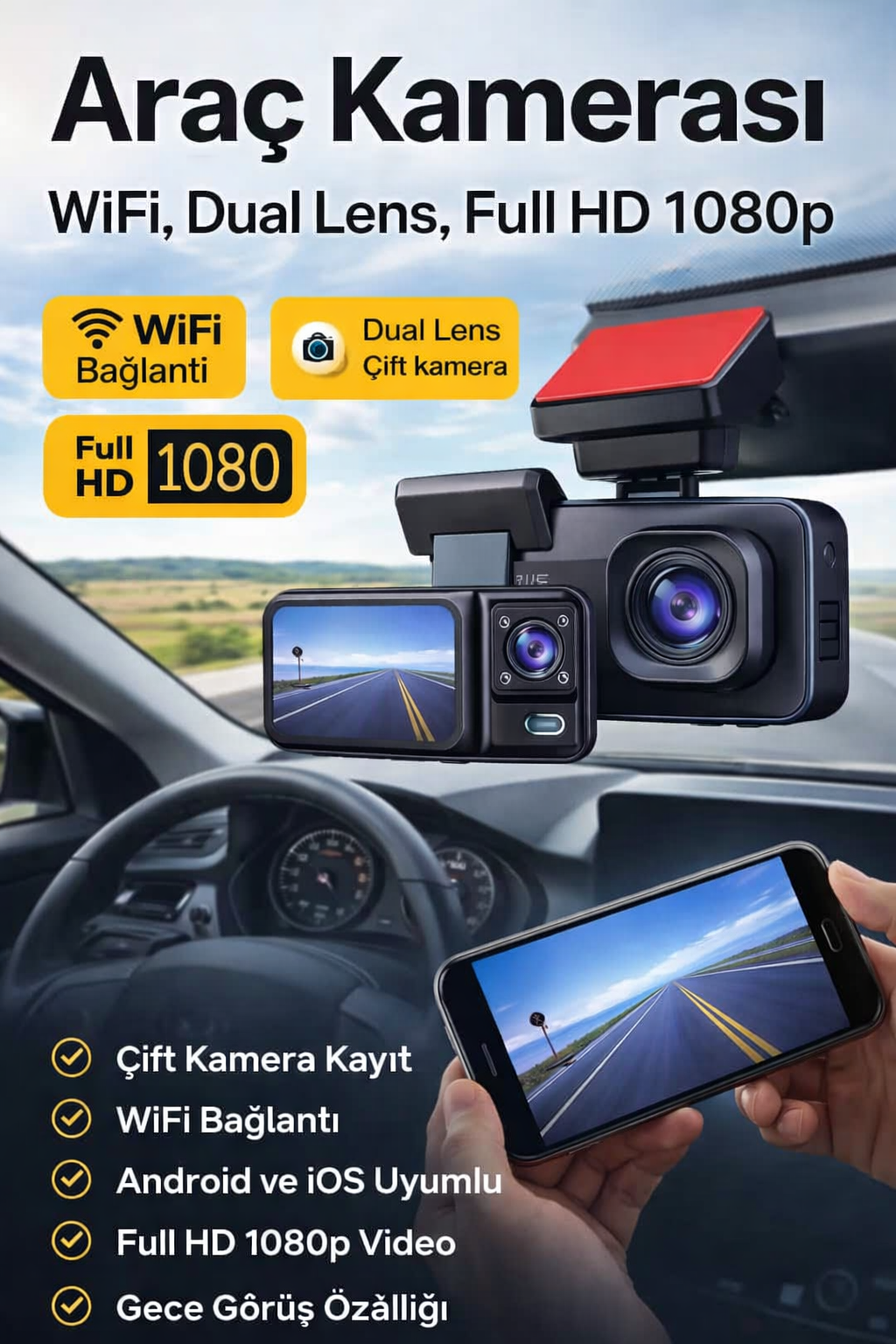 “Full HD 1080p WiFi Çift Kameralı Araç Kamerası (Dual Lens)” için yorum yapan ilk kişi siz olun